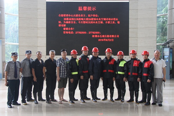 台风登陆深圳,石观公司值班人员立即启动防台风应急预案,杨娟经理亲自带领石观中层管理人员及应急抢险队全副武装,坚守岗位,密切留意台风动向,做好防风防涝的准备工作。