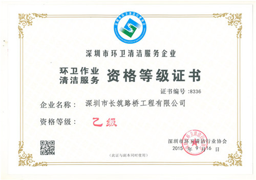 长筑公司获得环卫作业清洁服务资格等级乙级证书