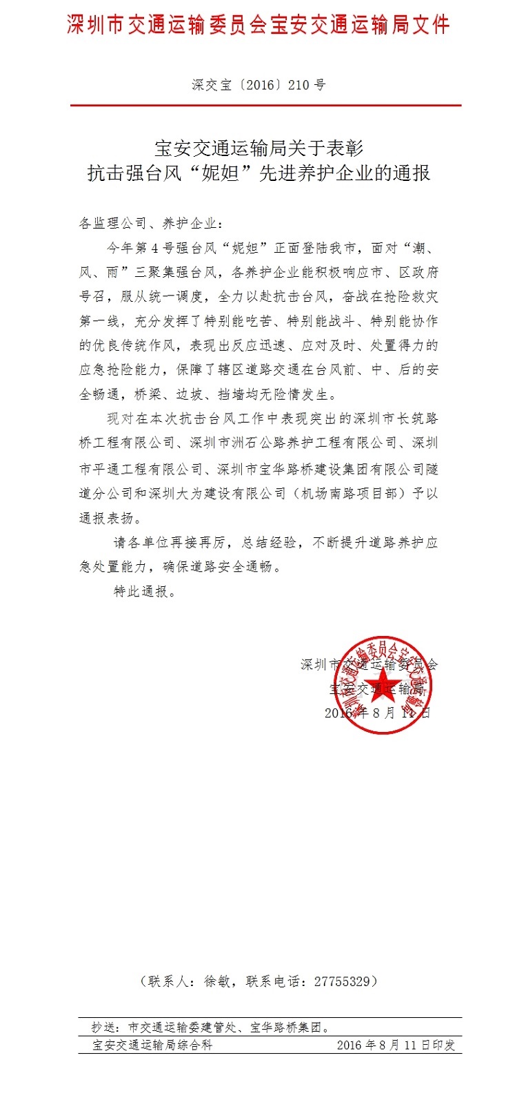 宝华路桥星空官网登录入口抗击台风表现突出受到宝安交通运输局的表彰