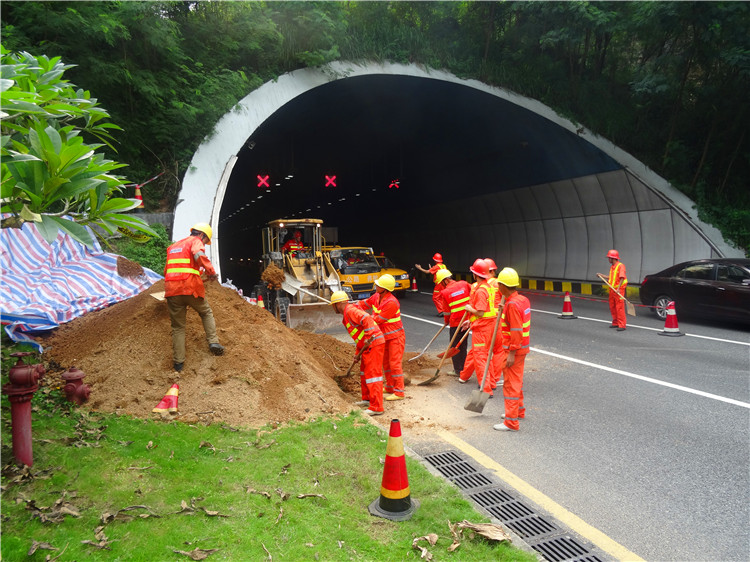 演练过程中,当巡查员发现险情,拉响“警报”后,应急抢险人员第一时间对事故现场进行了围闭警示和交通疏导,同时向业主、监理等单位报告险情,迅速联合交警、交管所等部门启动联动机制,快速有效地开展抢险救援工作。在勘定险情得以控制且无次生灾害发生的前提下,抢险人员立即对坍塌的泥土进行清理,消除险情,恢复交通。业主单位对凤凰山隧道应急演练工作给予了充分肯定。