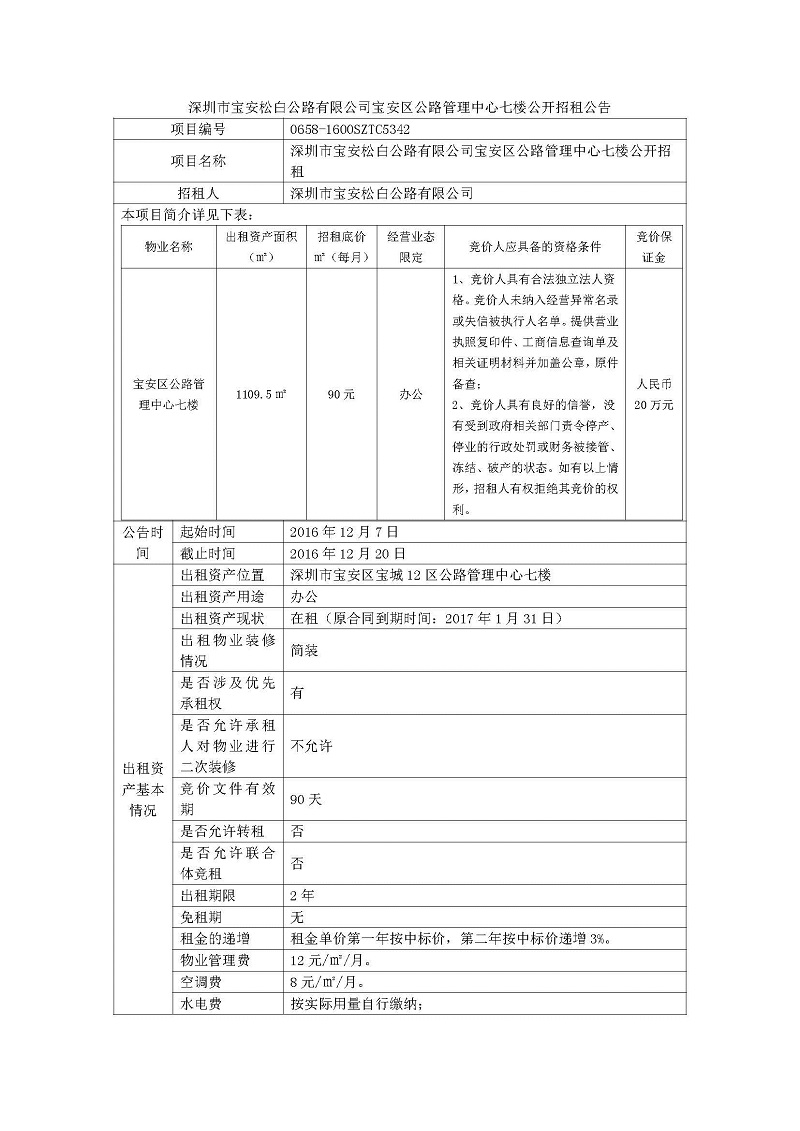 深圳市宝安松白公路有限公司宝安区公路管理中心七楼公开招租公告