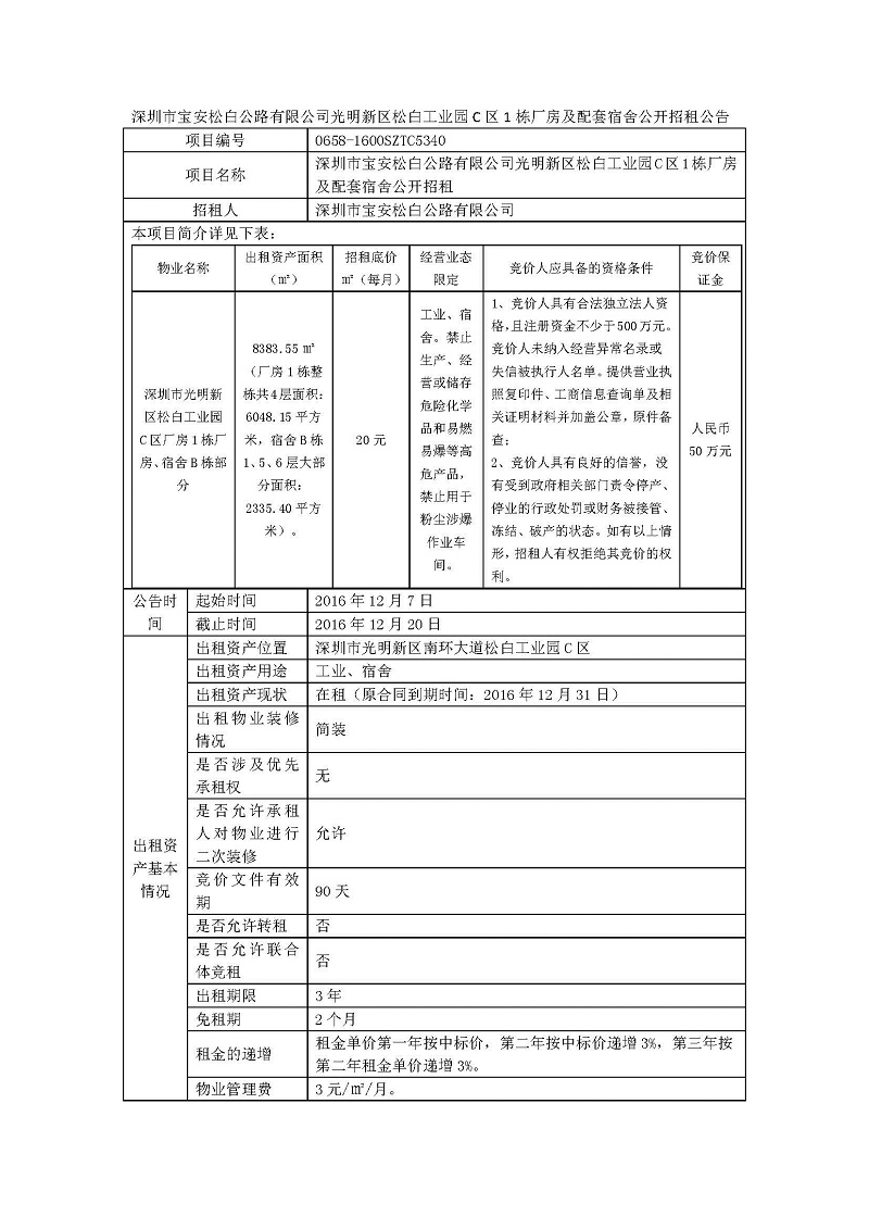 深圳市宝安松白公路有限公司光明新区松白工业园C区1栋厂房及配套宿舍公开招租公告
