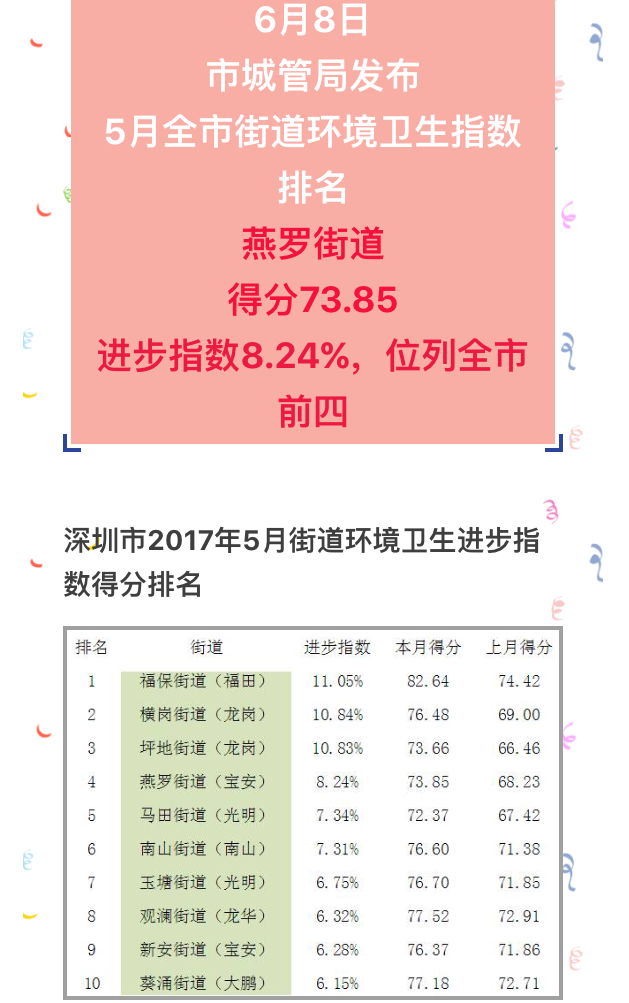 5月全市接到环境卫生测评,燕罗街道进步指数位列前四