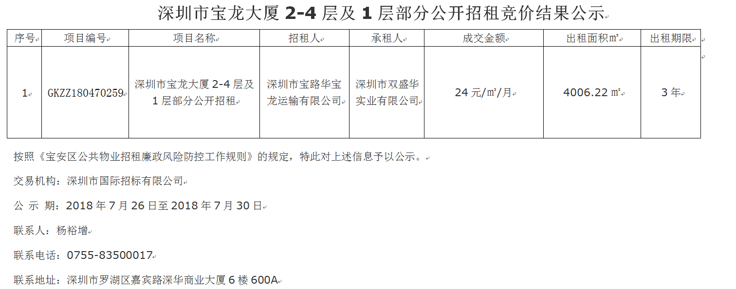 深圳市宝龙大厦2-4层及1层部分公开招租竞价结果公示