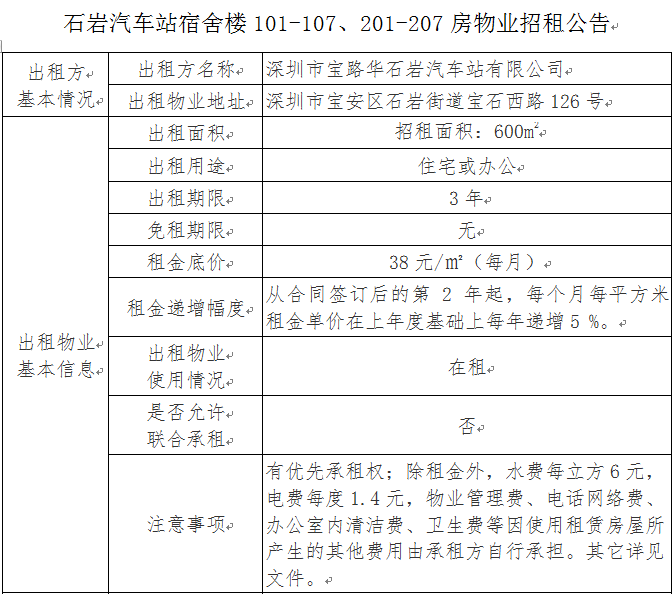 石岩汽车站宿舍楼101-107、201-207房物业招租公告