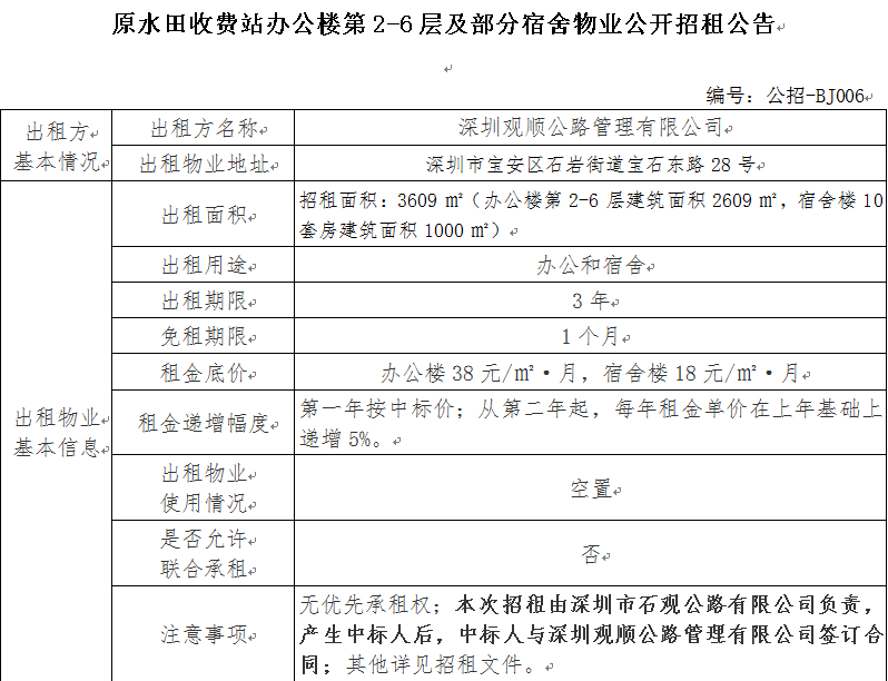 原水田收费站办公楼第2-6层及部分宿舍物业公开招租公告