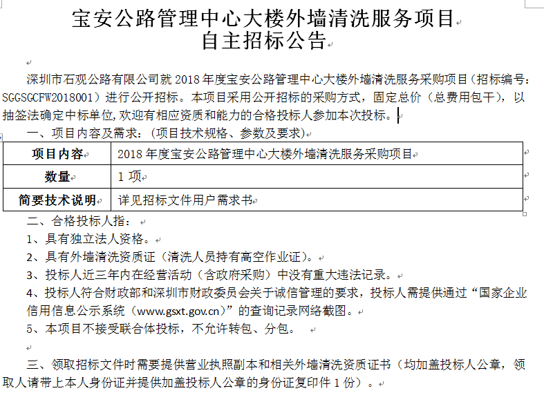 宝安公路管理中心大楼外墙清洗服务项目自主招标公告
