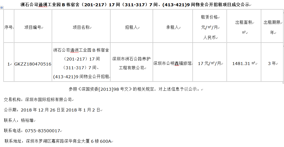 洲石公司通洲工业园B栋宿舍(201-217)17间(311-317)7间、(413-421)9间物业公开招租项目成交公示