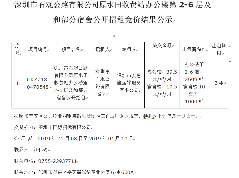 深圳市石观公路有限公司原水田收费站办公楼第2-6层及和部分宿舍公开招租竞价结果公示