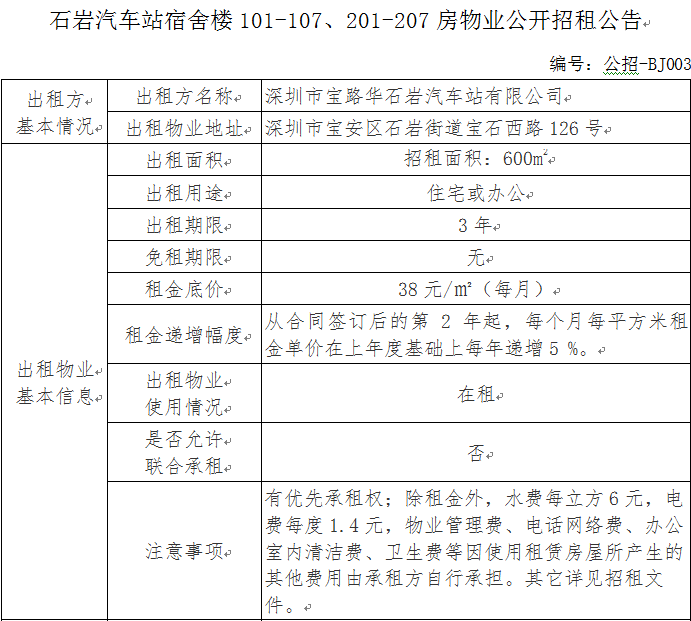 石岩汽车站宿舍楼101-107、201-207房物业公开招租公告