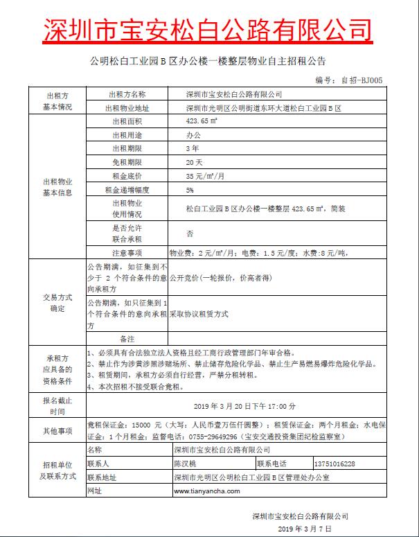 公明松白工业园B区办公楼一楼整层物业自主招租公告