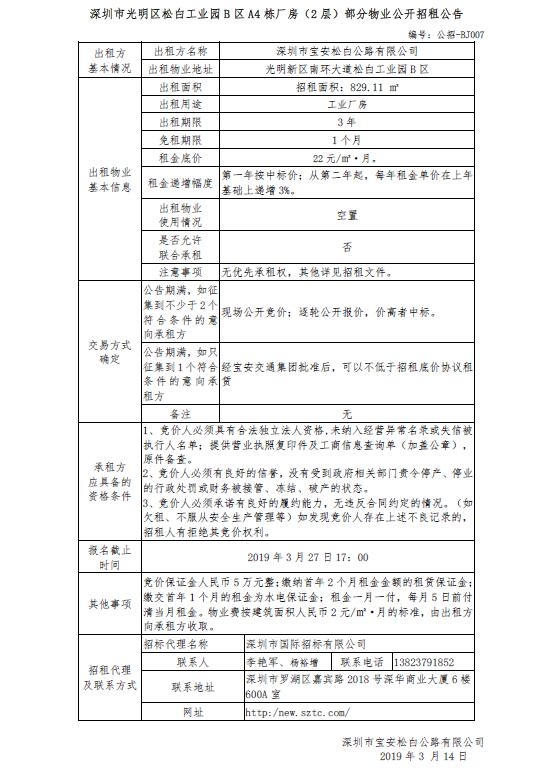 深圳市光明区松白工业园B区A4栋厂房(2层)部分物业公开招租公告