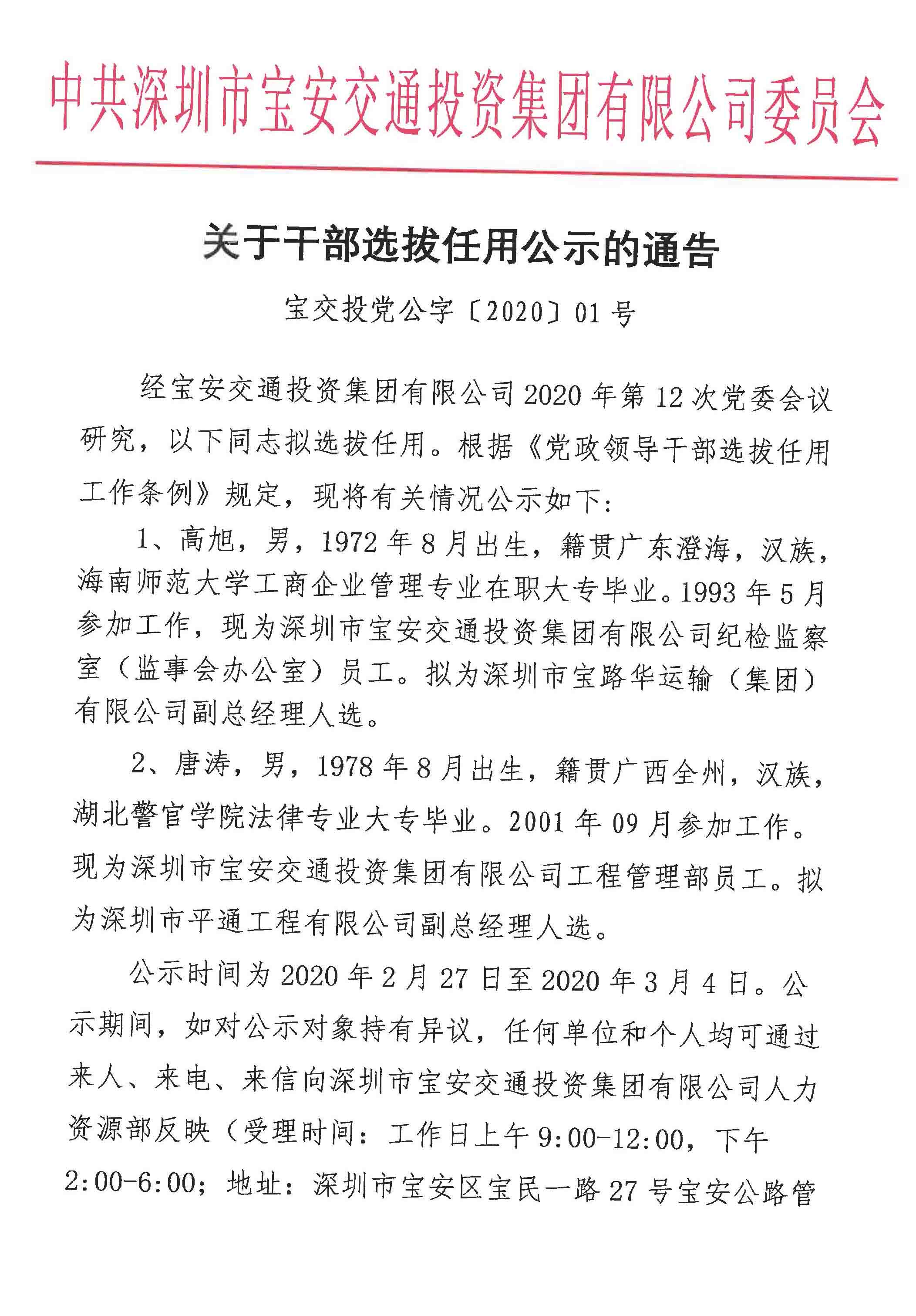 星空online(中国)干部选拔任用公示的通告(宝交投党公字〔2020〕01号)