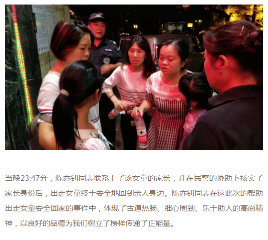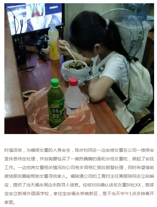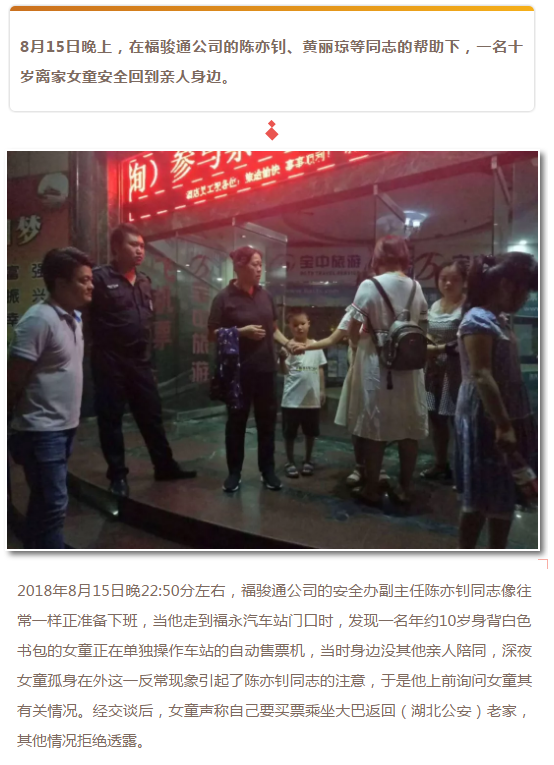 福骏通公司细心干部深夜帮忙寻亲,让出走女童顺利归家