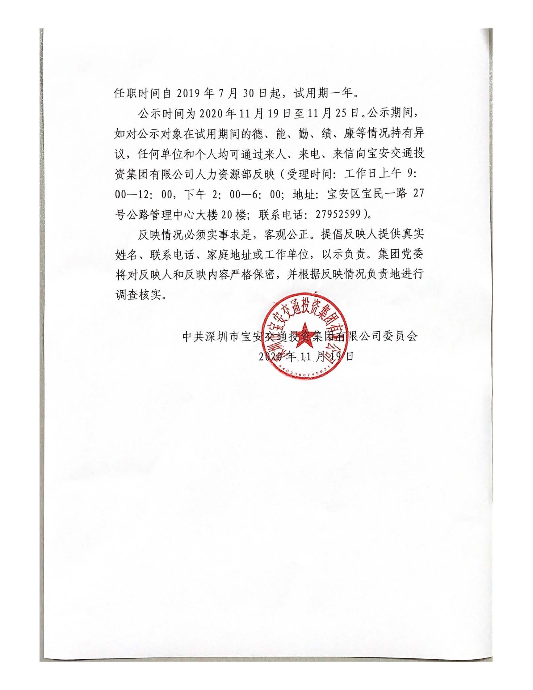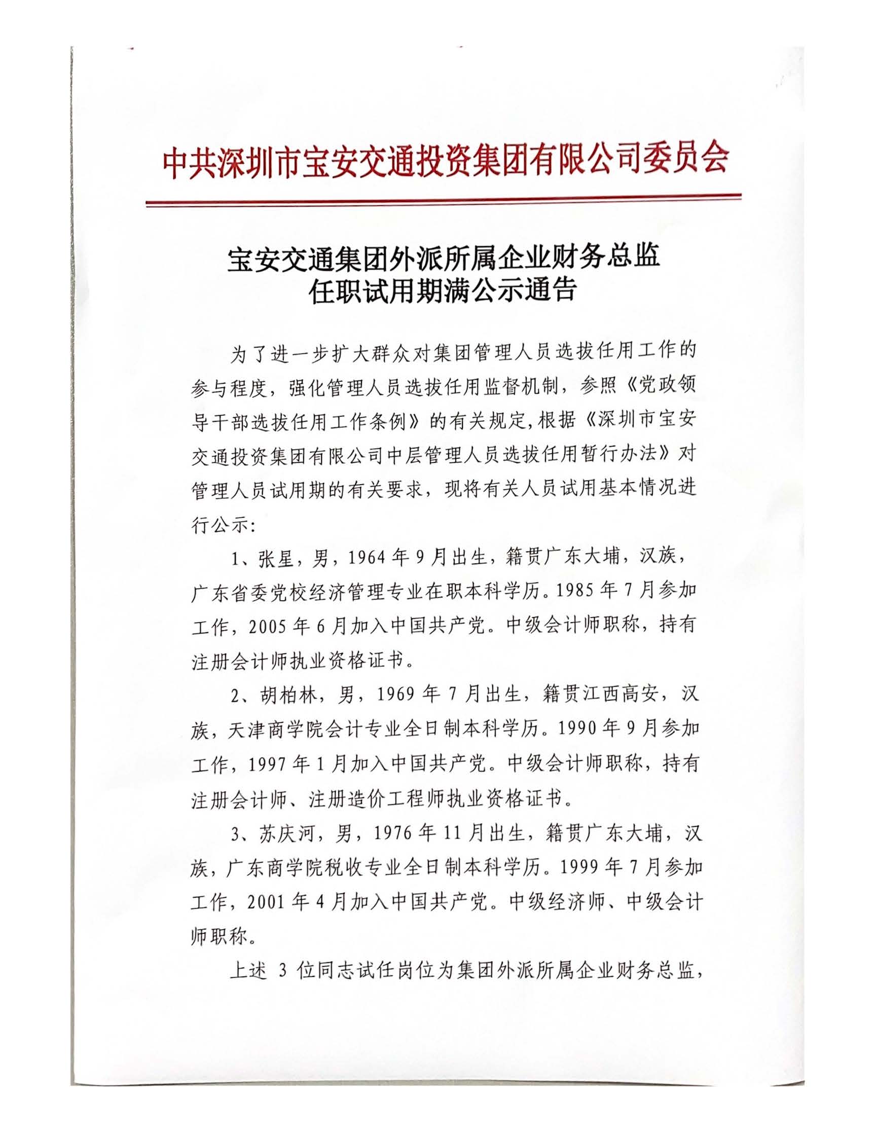 宝安交通星空官网登录入口外派所属企业财务总监任职试用期满公示通告