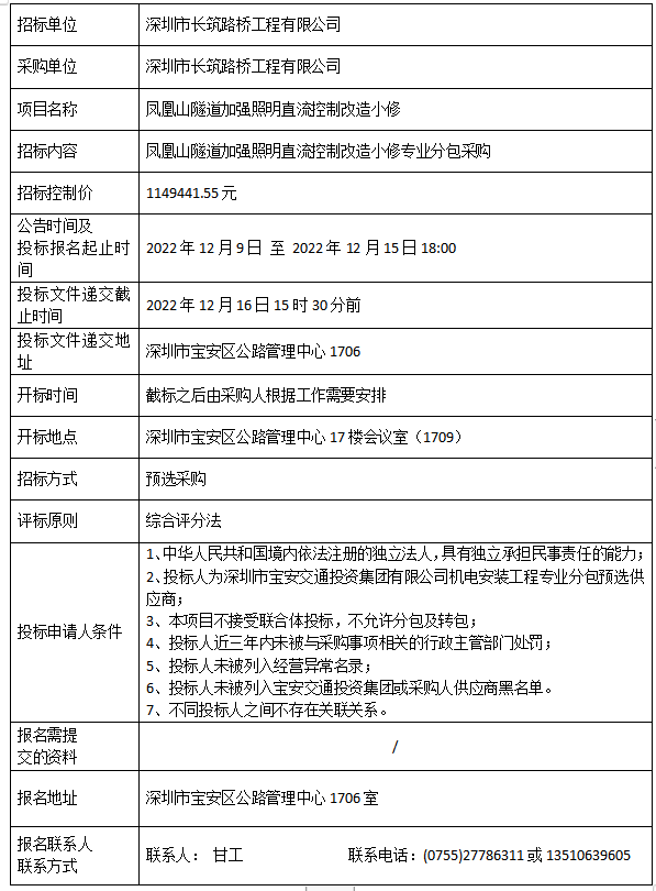 凤凰山隧道加强照明直流控制改造小修招标公告