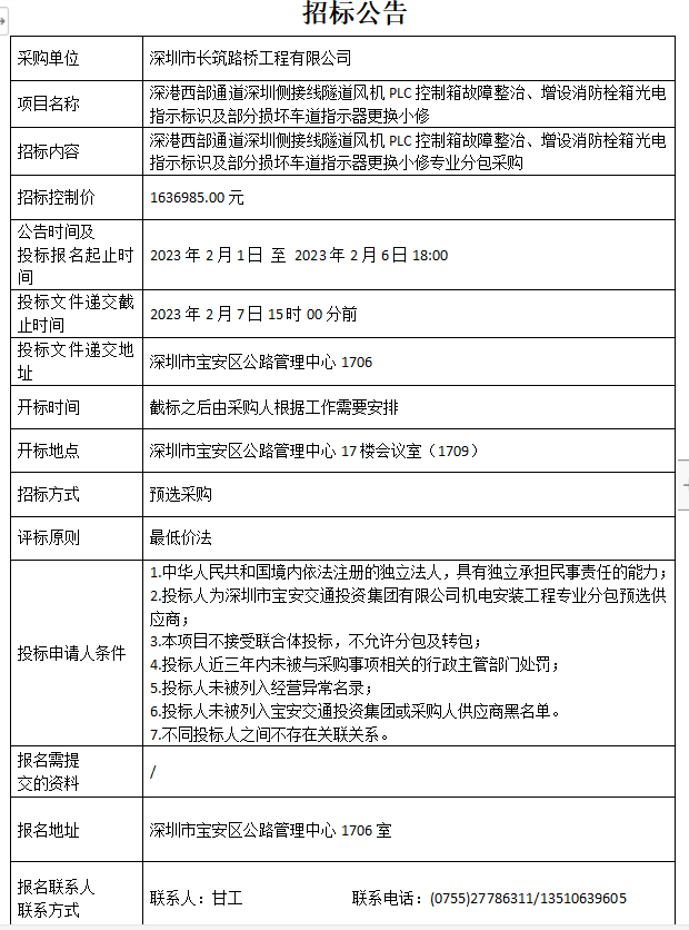 深港西部通道深圳侧接线隧道风机PLC控制箱故障整治、增设消防栓箱光电指示标识及部分损坏车道指示器更换小修招标公告