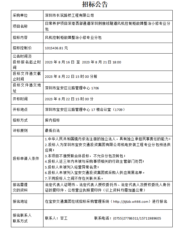 日常养护项目深港西部通道深圳侧接线隧道风机控制柜故障整治小修专业分包招标公告